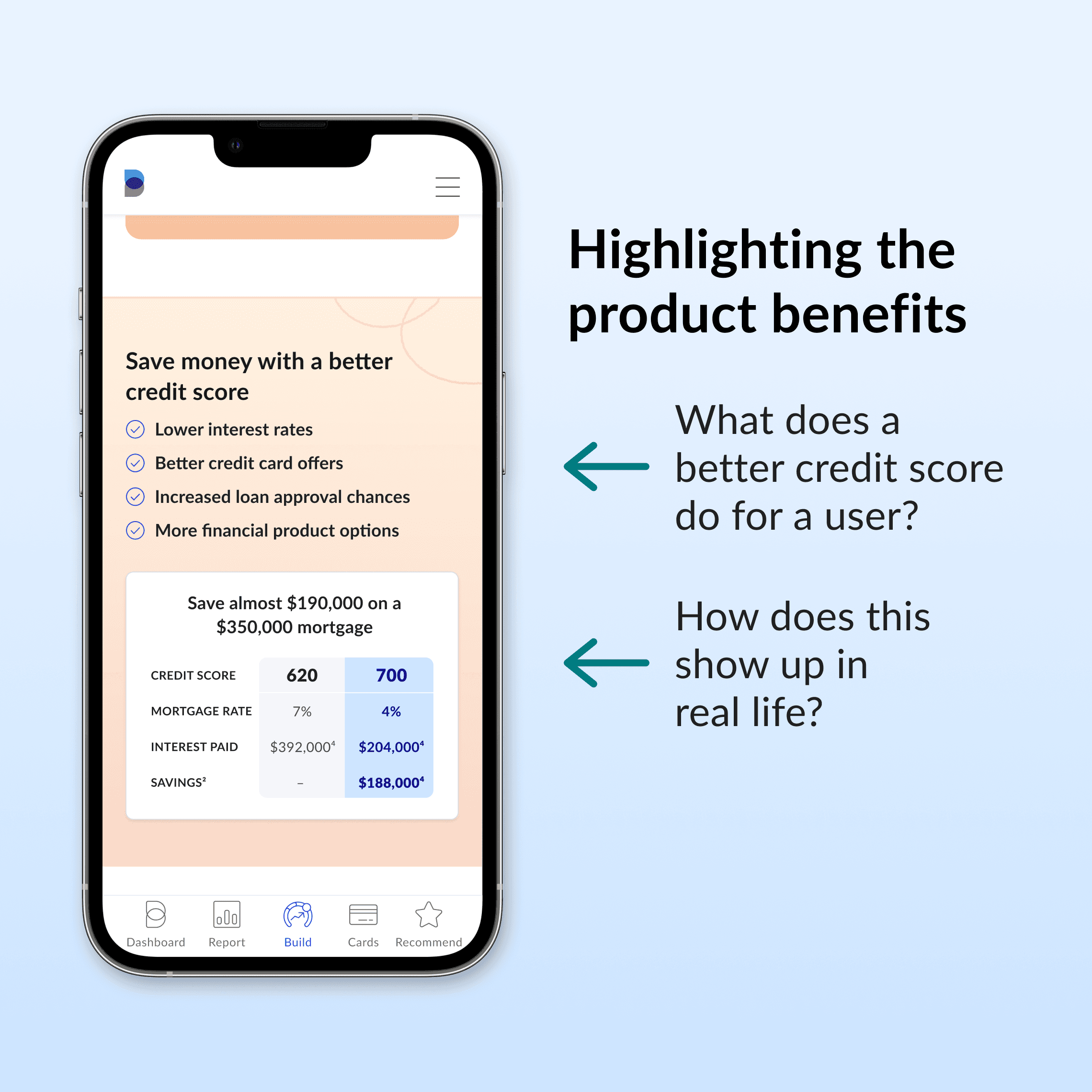 Adding proof of credit-building impact and showing a real-world example of how a higher credit score benefits users would increase conversion.